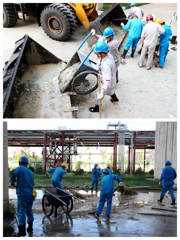 活動中,在黨支部書記的戰(zhàn)前動員和安排部署下,所有人員被分為兩組,對一級塔和二級塔進(jìn)行清理。布管、沖洗、鏟除、裝車、倒料,雖然現(xiàn)場配有兩輛裝載機,但由于大型機械無法靠近脫硫塔人孔,清理工作還需配合人力斗車,一車一車轉(zhuǎn)運。時間緊、任務(wù)重,全體隊員簡單解決午飯后,自覺放棄休息時間,匆匆又回到勞動現(xiàn)場,投入到與時間賽跑的戰(zhàn)斗中。歷經(jīng)8小時左右的全力奮戰(zhàn),下午16時所有工作圓滿結(jié)束。