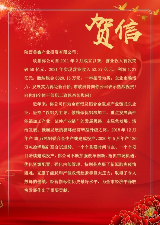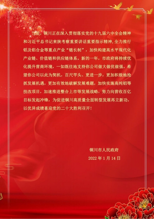 今年,在公司全體職工的共同努力下,公司上下克服重重困難,銳意進(jìn)取、努力奮進(jìn),圓滿完成全年目標(biāo)任務(wù),對銅川循環(huán)經(jīng)濟(jì)產(chǎn)業(yè)發(fā)展做出了自己的貢獻(xiàn)。銅川市政府專門發(fā)來賀信,并給予我公司“不斷加強(qiáng)改革創(chuàng)新,搶抓市場機(jī)遇,優(yōu)化資源配置,強(qiáng)化內(nèi)部管理,特別是克服了新冠肺炎疫情困難,克服了能耗和產(chǎn)能政策趨緊等巨大壓力,取得了令人鼓舞的佳績”的高度評價。現(xiàn)將《賀信》全文刊登,供大家認(rèn)真學(xué)習(xí),提振士氣,以更加飽滿的熱情投入工作。
