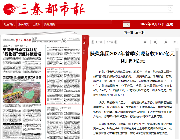 陜煤集團2022年首季實現(xiàn)營收1062億元利潤80億元 昨日,記者從陜煤集團獲悉,2022年一季度,陜煤集團主要產(chǎn)品產(chǎn)量和經(jīng)濟指標均創(chuàng)歷史新高,下屬黃陵礦業(yè)、蒲白礦業(yè)、檸條塔礦業(yè)、北元集團、紅柳林礦業(yè)等20余家單位均實現(xiàn)首季“開門紅”。陜煤集團煤炭、化工產(chǎn)品、粗鋼、發(fā)電量同比分別增長4.8%、8.4%、6.1%和9.6%。實現(xiàn)營收1062億元、利潤80億元,同比分別增長20.9%和66.7%。 據(jù)悉,目前穩(wěn)增長壓力大、任務(wù)重的緊迫形勢,陜煤集團注重精準施策,強化責任擔當。成立穩(wěn)增長工作領(lǐng)導(dǎo)小組,制定煤炭保供穩(wěn)價工作方案,建立穩(wěn)增長專項考核機制,多次召開穩(wěn)增長工作推進會,協(xié)調(diào)解決穩(wěn)增長工作中存在的突出矛盾和主要問題。 面對疫情反復(fù),陜煤集團科學組織生產(chǎn),統(tǒng)籌推進疫情防控和滿產(chǎn)達產(chǎn)。36對生產(chǎn)礦井和所有發(fā)電企業(yè)春節(jié)期間滿負荷生產(chǎn),充分釋放智能化礦井的先進產(chǎn)能,有力保障國家能源安全穩(wěn)定供應(yīng)。 發(fā)揮自有鐵路、自備車等產(chǎn)業(yè)鏈供應(yīng)鏈優(yōu)勢,陜煤集團一季度日均煤炭產(chǎn)量和發(fā)電量產(chǎn)能釋放遠超去年同期水平。扎實推進安全生產(chǎn)專項整治三年行動,持續(xù)開展安全生產(chǎn)大排查大整改,大力實施減污降碳協(xié)同增效。 同時,陜煤集團成立領(lǐng)導(dǎo)掛帥項目前期工作小組,扎實推進“十四五”項目前期手續(xù)辦理。打出強組織協(xié)調(diào)、促項目建設(shè)、控投資概算、保工程質(zhì)量“組合拳”,搶抓國家煤炭保供、發(fā)展煤基特種燃料等政策機遇,加快建設(shè)榆林化學一期、神木煤化工煤焦油加氫制環(huán)烷基油和孟村煤礦等一批“十四五”重點產(chǎn)業(yè)項目。 全力實施國企改革三年行動,持續(xù)優(yōu)化集團管控模式,積極融入秦創(chuàng)原建設(shè),設(shè)立30億元科技研究創(chuàng)新基金,聚焦新材料、新能源、新經(jīng)濟,以改革創(chuàng)新催生穩(wěn)增長新動能。下一階段,陜煤集團將堅持穩(wěn)字當頭、穩(wěn)中求進工作總基調(diào),持續(xù)鞏固生產(chǎn)企業(yè)高產(chǎn)穩(wěn)產(chǎn)態(tài)勢,大力推進重點項目建設(shè),強化資金保障,筑牢安全環(huán)保基礎(chǔ),為全省經(jīng)濟社會健康穩(wěn)定發(fā)展和穩(wěn)增長貢獻“陜煤力量”。 |
