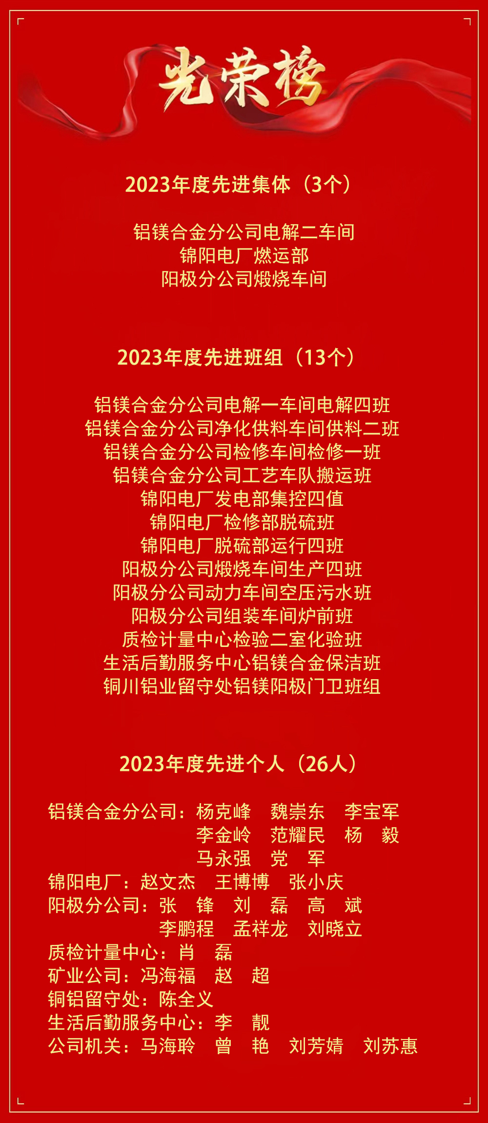 2023年,在集團(tuán)公司的正確領(lǐng)導(dǎo)下,公司上下以習(xí)近平新時(shí)代中國(guó)特色社會(huì)主義思想為指引,全面貫徹落實(shí)黨的二十大精神,在廣大干部職工的共同努力下,安全生產(chǎn)、經(jīng)營(yíng)工作、精益管理等各項(xiàng)工作取得了顯著成績(jī),涌現(xiàn)出一批先進(jìn)集體和先進(jìn)個(gè)人。 為表彰先進(jìn),樹(shù)立典型,進(jìn)一步激發(fā)廣大職工的工作積極性和熱情,經(jīng)基層單位推薦申報(bào),公司先進(jìn)評(píng)選委員會(huì)審核,公司黨委研究決定:授予鋁鎂合金分公司電解二車間等 3 個(gè)單位“先進(jìn)集體”榮譽(yù)稱號(hào);授予錦陽(yáng)電廠發(fā)電部集控四值等 13 個(gè)班組“先進(jìn)班組”榮譽(yù)稱號(hào);授予楊克峰等 26 名同志“先進(jìn)個(gè)人”榮譽(yù)稱號(hào)。 希望各單位和全體干部職工向受表彰的先進(jìn)集體和先進(jìn)個(gè)人學(xué)習(xí),以他們?yōu)榘駱,團(tuán)結(jié)協(xié)作、開(kāi)拓進(jìn)取、扎實(shí)工作、全力以赴,為公司高質(zhì)量發(fā)展做出新的更大的貢獻(xiàn)! |